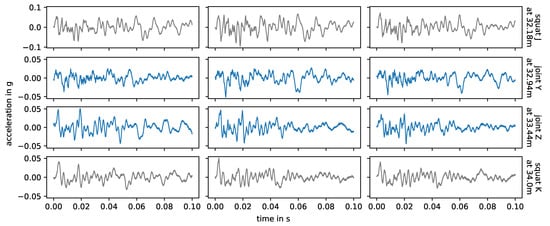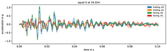 Measurement data of squat G, colored by direction and axle. The data are band-pass filtered to 10–1000 Hz after standard pre-processing and aligned using the timelag derived from the correlation coefficient (maximal allowed timelag set to 0.01 s).