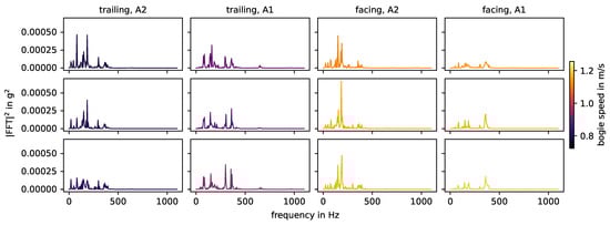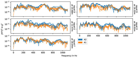 For the squats in the area of the intermediate rails, especially the axle seems to have a strong impact on the correlation between the impact event data. Figure 9 shows the respective energy spectral densities of all measurements, colored by axle. For certain frequency ranges between 200 Hz and 1000 Hz, there are systematic differences between the energy spectral densities related to the two axles, but the effect changes for every squat. Generally, another axle between the sensor and the impact event origin changes the transmission of the signal. The rails between the sensor and the impact event origin are pre-loaded. Here, this is the case for axle A1, but not for axle A2 (independently of the driving direction). Recalling the previous discussion of the natural frequencies of the switch in the experiment, the higher frequencies between 200 Hz and 1000 Hz include rail on railpad and pin-to-pin vibrations, while the lower frequencies below 200 Hz include the rail and sleeper on ballast vibration. A load on the track should have a greater effect on the first two than on the latter. However, different frequencies have different transmission rates through different media, so the change in system configuration from one axle to another may affect the transmission rate for each frequency differently.