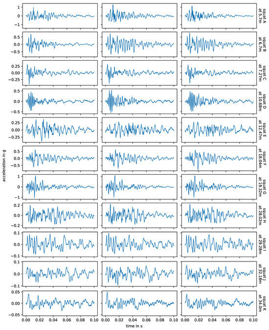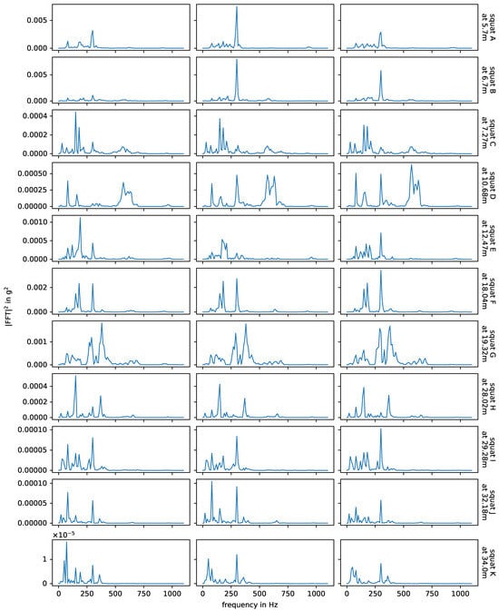 Figure 10 shows the impact events caused by squats and axle A2 in measurements with facing driving direction, and in Figure 11 we see the corresponding energy spectral densities. In this case, the bogie is moving away from the sensor and the impact events are caused by the axle closer to the sensor, i.e., there is no other axle in between the impact origin and the sensor. The bogie speed varies little between the three measurements of each squat, but it is not constant over the whole switch and may affect the plot. The relation between amplitude and distance to sensor is non-linear, as already discussed at the end of Section 3.1. The squats H, I, J and K are farthest away from the senors and do have significant lower amplitudes. For each individual squat, the waveforms of all three measurements (i.e., one row in the plot) are nearly the same and the energy spectral densities are also very similar, but there are huge variations between squats. The waveforms in particular are very distinct and unique. Squats that are located closely to each other are more similar than those further apart, e.g., squats A and B and squats J and K. The frequencies observed for the squats line up with the natural frequencies of the experimental setup discussed in Section 3.1 and shown in Figure 4. The overall most prevalent one is approximately 300 Hz, though this is not the case for all squats.