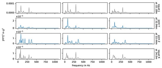 Energy spectral densities of joint Y and Z (blue) and adjacent squats (gray), observed in facing measurements, caused by axle A2. Each column corresponds to one measurement (i.e., one bogie passage over the switch), each row to a specific joint or squat, compared to Figure 11.