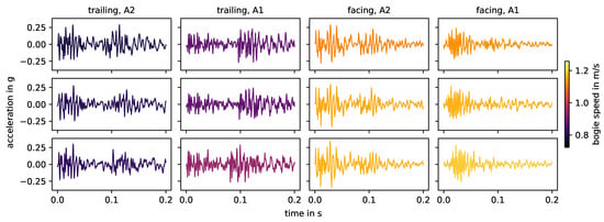 - Bogie speed: Influences the strength of impact events. Theoretically, higher speeds can also change the geometry of impact events (cf. []) due to a loss of contact between wheel and rail, but this is not the case in the experiment.