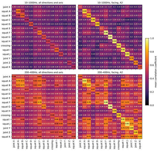 To compare the different track discontinuities and defects in the experiment, the waveform of their impact events are directly compared using the correlation coefficient. Figure 16 shows the mean correlation coefficient between impact event time series of the track discontinuities and defects in the experiment. For the top plots, the data are band-pass filtered to 10–1000 Hz, for the bottom plots to 200–400 Hz. The plots on the left contain all combinations of all driving directions and axle, the plots on the right only in the facing direction and axle A2. In each plot, the diagonal contains the average of correlation coefficients between different impact events caused by the same origin. The non-diagonal elements are the average of correlation coefficients between impact events caused by two different origins. For 10–1000 Hz, all driving directions and axles, the average correlation coefficient between different impact events caused by the same origin is 0.53 (min 0.12, max 0.98), while the average correlation coefficient between impact events caused by two different origins is 0.32 (min 0.08, max 0.75). The corresponding values for facing direction and axle A2 only are 0.81 (min 0.39, max 0.98) and 0.31 (min 0.10, max 0.63). Thus, again, the direction and axle have a strong impact on the waveforms, but if both are kept the same, impact events caused by the same origin are highly reproducible. This is in agreement with the previously presented results. For 200–400 Hz, all driving directions and axles, the average correlation coefficient for impact events of the same origin is 0.62 (min 0.13, max 0.99) and that of different origins is 0.50 (min 0.09, max 0.91). The corresponding values for facing direction and axle A2 only are 0.83 (min 0.51, max 0.99) and 0.51 (min 0.16, max 0.86). Filtering the data to a narrow frequency band around 300 Hz, all impact events have more similar waveforms, regardless of origin, direction or axle. Differentiation by individual origin becomes increasingly difficult, even for only one direction and axle.