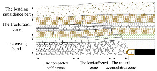 During the advancement of the mining face, the key stratum, as the load-bearing structure of the overlying rock layers, undergoes a dynamic evolution process of stability, rupture, hinge, and re-stabilization under the influence of its own weight and the load from the overlying rock layers. With the repeated occurrence of this process, the voids in the collapsed rock mass beneath the key stratum along the mining face exhibit distinct partition characteristics, namely: the natural accumulation zone, the load-affected zone, and the compacted stable zone [16,17,18], as illustrated in Figure 2.