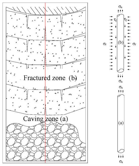 After coal seam extraction, as the overlying rock continuously collapses from the bottom to the top, the rock layers exhibit distinct zonal collapse features with corresponding zonal stress changes within the rock layers due to mining. In this context, the mechanical force state of the rock layers and the optical fiber within the collapse and fracture zones is discussed. A mechanical analysis model for the deformation of rock layers in the collapse and fracture zones with vertical fiber optics is established, as shown in Figure 3.
