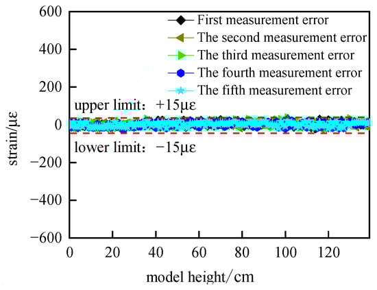 Five repetitive measurements of the optical fiber embedded in the model were performed to verify the uncertainty of the optical fiber test system before model mining. The strain uncertainty due to the system error is obtained from the difference between the last four measurements and the first one, and the test results are shown in Figure 6, where the horizontal coordinate is the length of the model and the vertical coordinate is the strain on the fiber.