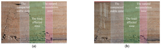 The states of overlying rock collapse at the 37th and 44th excavation steps are shown in Figure 7. At the 37th step, a large area of the overlying rock layer collapsed due to the fracture of the old roof, with a collapsed height of 40 cm, a collapsed upper boundary width of 30 cm, and free spaces in the collapsed rock layers reaching a maximum height of 2.5 cm. When the working face reached the 44th step, the collapsed rock layer had a height of 65 cm, a width of 37 cm, and the free space continued to develop upwards due to rock fragmentation. The free space was reduced due to rock dilation, with a height of 1 cm. Clear zones could be observed above the collapse zone, namely, the natural accumulation zone, the load-affected zone, and the compacted stable zone, as shown in Figure 8.