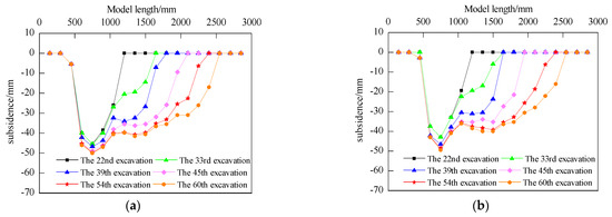 Roof Layer Subsidence Curves. (a) 99 mm above the coal seam. (b) 146 mm above the coal seam.