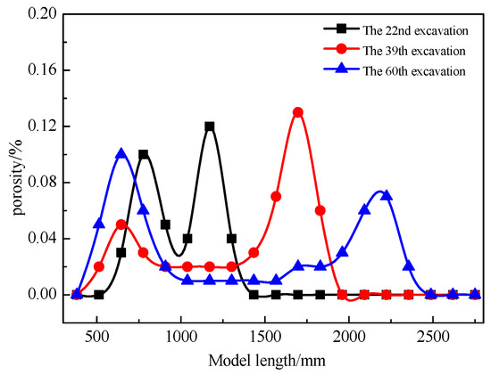 From the porosity distribution curves in the collapse zone, it can be observed that the change trend in porosity along the direction is consistent for different excavation cycles, showing an overall “saddle-shaped” distribution. This means that the porosity is higher near the coal pillars on both sides of the goaf, decreases in the middle area, and peaks near the working face. As the working face advances, the peak in porosity gradually moves forward, and the porosity behind the peak decreases. Based on the distance from the working face, these zones can be classified as the natural accumulation zone (0–100 mm behind the working face), the load-affected zone (100–400 mm behind the working face), and the compacted stable zone (beyond 400 mm behind the working face).