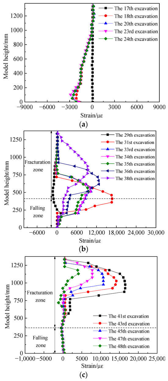 To understand the variation in fiber optic strain values as the working face approaches, passes through, and moves away from the fiber optic cable throughout the entire process, we focus on the results from the V1 fiber optic cable. Figure 11 shows the strain monitoring results for V1 during the mining process. The vertical axis represents the model’s height, and the horizontal axis represents the strain monitoring values provided by the fiber optic cable. The positive strain values indicate fiber tension, while the negative values indicate fiber compression.