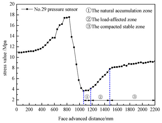 Figure 12 shows the variation in stress as the working face advances at the location of pressure sensor No. 29. The results reveal that as the working face advances, stress changes as follows: in the range from 0 to 608 mm, stress remains almost unchanged. Between 608 and 836 mm, stress rapidly increases, reaching a peak of 17.58 MPa at 836 mm. This increase is primarily due to the influence of advance support pressure from the working face. In the range from 836 to 1064 mm, the stress curve rapidly decreases. In the range from 1064 to 1178 mm, stress remains at its lowest. This is because the working face has just passed the location of pressure sensor No. 29, and the coal seam forms a “cantilever beam” structure, resulting in a low-stress area at this location. In the range from 1178 to 1482 mm, stress gradually increases, as the “cantilever beam” structure above the coal seam has fully ruptured and is rebounding under the effect of the overlying load. Beyond 1482 mm, the stress remains relatively constant, indicating the recompaction of the collapsed rock mass.