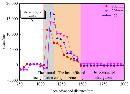 When the working face moves away from the V1 fiber optic cable, as shown in Figure 11c, the strain values within the range of 0–462 mm (collapse zone) become negative, indicating that the rocks in this zone are consolidating. Within the range of 462–1353 mm (fracture zone), the strain values are positive, indicating tension in the rocks. As the working face continues to advance, the strain values in the range of 0–462 mm stabilize, while those in the range of 462–1353 mm gradually decrease and stabilize. This suggests that the rocks around the V1 fiber optic cable have undergone full deformation, and further mining no longer significantly affects their deformation.