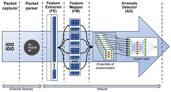 The Anomaly Detector, referred to by its authors as KitNET [] (KitsuneNETwork), can be used independently as an anomaly detector if data are available in the form of continuous feature vectors.