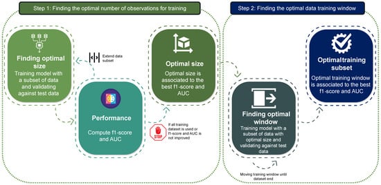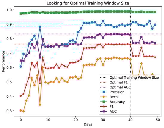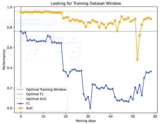 In Figure 9, the evolution of the F1-score indicates that the optimal window covers the initial 40 days of the UGR’16 training dataset. This is due to a significant decrease in the indicator as the window is shifted within the dataset. However, the AUC remains relatively stable in the initial iterations. This could be explained by the imbalanced nature of the dataset.