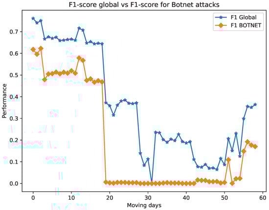 To further analyse of the results obtained in this phase of the methodology, Figure 10 shows the evolution of the total F1-score metric, as well as the F1-score metric solely for botnet-related attacks. Based on the given information, it seems that the decline in the F1-score of the model corresponds to the significant decrease in the F1-score related to botnet attacks. This implies that there are hints of botnet attacks present in the training set of UGR’16 by 19th May 2016 that remain undetected.