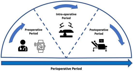 Figure to show the stages across the perioperative period. The perioperative pathway refers to the period that spans from the first point at which surgery is considered as a treatment option up until the full recovery [19]. This pathway has several sub-stages [20]. The preoperative period represents the period prior to surgery where any preoperative assessment takes place. The intra-operative period is representative of the period whilst the patient is undergoing treatment. The postoperative period relates to any period immediately following the operation and can continue after patient discharge.