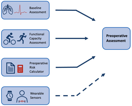 Figure to show common preoperative assessment tools used in practice. The top three boxes present common forms of preoperative assessment that are regularly used in practice (see Section 1.1), whilst the last box with a dashed arrow is included to show the potential for wearable sensors to be used alongside common methods in this context.