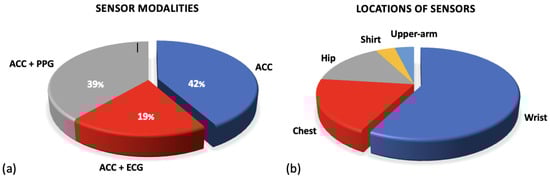 Figures for sensor modalities. (a) Shows the percentages of sensor modalities used across research. All research employed accelerometer sensors but a further subsection combine this with either ECG or PPG sensors. (b) Figure to show the variations in locations of sensor types. The common locations for sensors used in research applicable to the preoperative period are outlined.