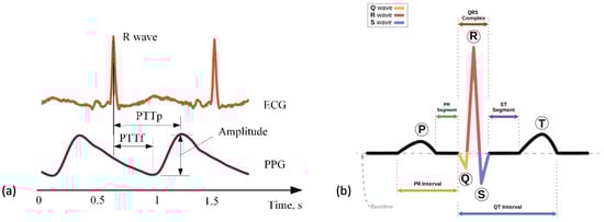 Figures to show the recordings produced from ECG and PPG recordings. (a) A comparison of the cardiac signals produced from a PPG versus ECG sensor over a period of 2 s. This figure was produced by Elgendi et al. (2019) and was taken from a larger figure with no changes made as part of the Creative Commons Attribution International 4.0 License [92,100]. (b) A segment of an ECG graph that has been portioned to show the stages in a normal cardiac cycle including the P wave, the QRS complex and the T-wave.