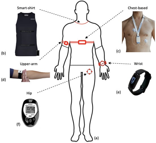 Figure to show wearable sensor devices used in research across the body (a) and where these are located (b–f). (b) The Hexoskin smart shirt that collects both ECG and activity data, used with permission from Hexoskin [117]. (c) An ECG wearable device that collects recordings from a single-lead ECG device and 3D-accelerometer data, used with permission from [118]. (d) An upper-arm PPG sensor utilising reflective PPG detection, similar to that used in preoperative monitoring research [119]. The figure is taken as part of a larger figure from Wang et al. (2023), Creative Commons Attribution International 4.0 License [92,120]. (e) The Fitbit Inspire collects a combination of accelerometer and PPG data from the user and is commonly used in preoperative research. The figure is taken from Li et al. (2023), Creative Commons Attribution International 4.0 License [92,121]. (f) The OMROM walking style pedometer that utilises a tri-axis accelerometer to collect step data, used in predicting VO2 max [78]. This figure is taken from Bartlett et al. (2017) as part of a larger figure, Creative Commons Attribution International 4.0 License [92,122].