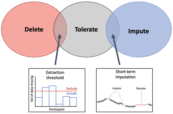 Across research applicable to the preoperative period, three different strategies for handling missing periods of data were employed. As seen in Figure 7, missing periods of data were either deleted entirely, tolerated or imputed. These techniques have been previously identified in research using WS and are common solutions for missing data across fields [124,126]. To build on this, several techniques were identified in the present review that involve overlap between categories. To differentiate between data that has missing portions but is still usable versus data that should be deleted, an extraction threshold can be identified. Further, some research employs imputation on only short-term segments of data (see Section 3.1.3).