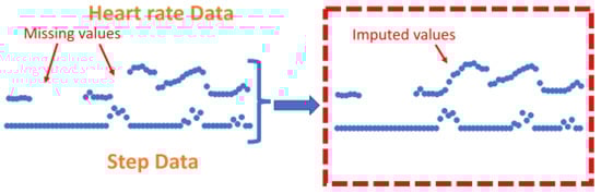 Figure to show imputation using K-nearest-neighbours. Zhang et al. (2023) utilise the KNN technique to impute on short-term segments of missing data under 10 min in length by utilising previous values from both the step count and heart rate signals to calculate missing values. This figure was produced by Zhang et al. (2023) and was taken from a larger figure but had no changes made, taken as part of the Creative Commons Attribution International 4.0 License [71,92].