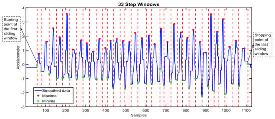 Graph to show the implementation of a maxima and minima step-counting algorithm that counts step number based on the number of steps windows detected. Each red line indicates the stopping point of each step window and the start of the next corresponding window, the length of time between each red vertical line indicates the step window size [142]. This figure was produced by Ho N et al. (2016) and was taken with no changes made, used as part of the Creative Commons Attribution International 4.0 License [92,142].