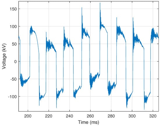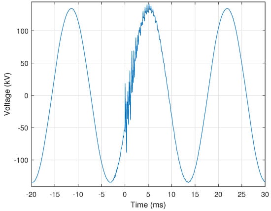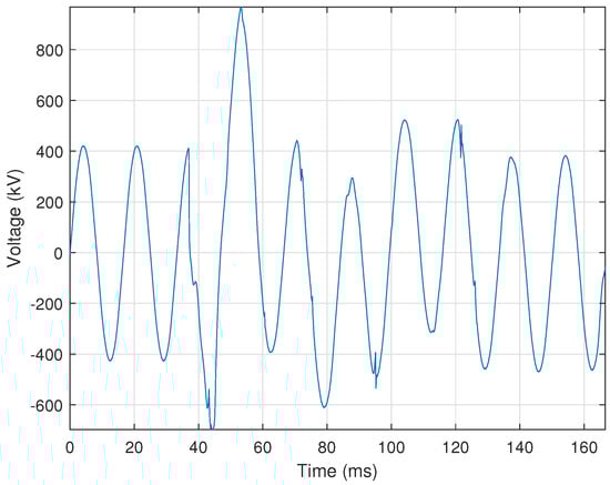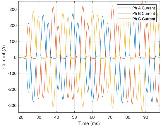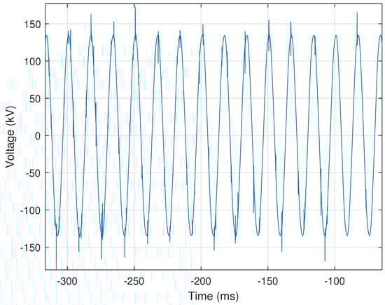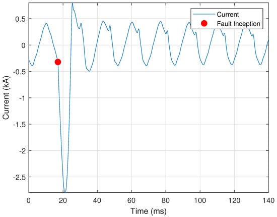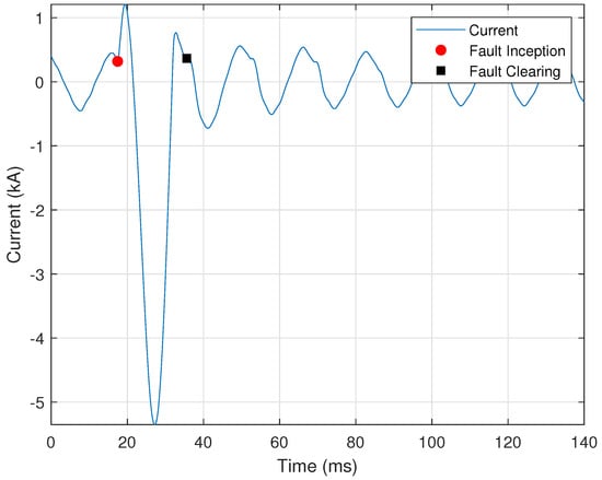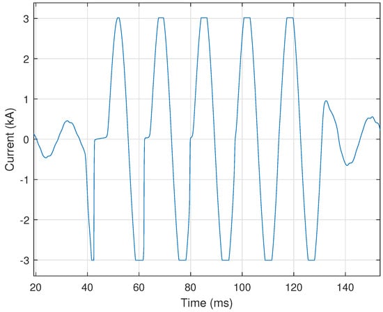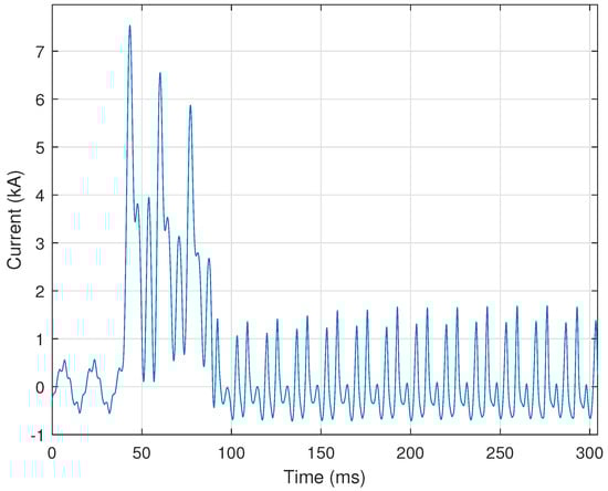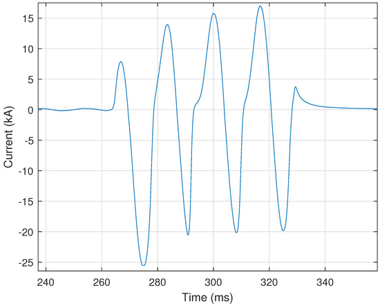 The first PQ event analyzed is Current Transformer (CT) saturation. A CT is commonly used in relaying or metering applications in high-voltage circuits by producing an alternating current in its secondary winding proportional to the current it is measuring on the high-voltage system. These low-voltage low-magnitude currents are then used as input signals to various instrumentation [20]. CT saturation occurs when the primary current is so high that its core cannot handle more flux. This results in inaccurate replication of the current signal on the secondary winding, which can cause protection relays to operate improperly. A key indicator of CT saturation is a change of slope as the current crosses zero each half-cycle. This change in slope is commonly referred to as “kneeing”. Figure 4 shows a representative illustration of “kneeing”—between 280 ms and 320 ms—within a CT’s current signal.