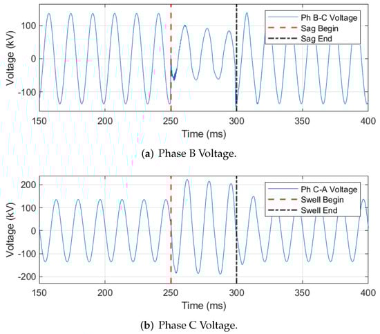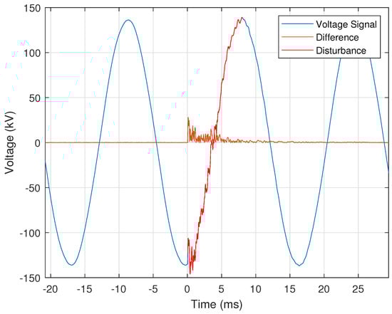 The CSV files generally store at least fifteen cycles of the nominal voltage and current signals before the disturbance event; thus, a useful disturbance detection approach is to compare the signal’s first cycle with each remaining cycle within the CSV file. After the first cycle is selected, it is replicated to construct an ideal signal of the same length as the recorded signal from which the first cycle was extracted. The generated ideal signal is then subtracted from the recorded signal. The time indices at which this difference is very high indicate the start of a disturbance. Figure 2 illustrates the application of this approach in detecting the start of a capacitor switching event within a recorded voltage signal. Figure 2 shows the voltage signal, with the capacitor switching disturbance portion of the signal highlighted and the result of the difference calculation overlaid. The difference calculation is highest corresponds to the start of the capacitor switching event, which is assigned a start time of zero milliseconds.