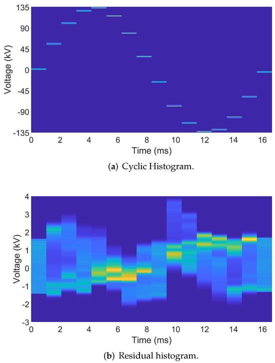 A cyclic histogram is a combination of per-sample histograms concatenated to show the quality of the signal over time. For the case of , sixteen histograms are generated for each sample in the nominal cycle and stored in a matrix that represents the cyclic histogram. The global minimum and maximum of all synchronized cycles are used as the bin limits of all histograms to maintain a consistent scale for the cyclic histogram. Each histogram is generated using the nth sample of each synchronized cycle. By default, there are 1024 bins per histogram; utility personnel can increase or decrease this resolution as needed. A larger number of bins increases the size of the generated output file. The cyclic histogram is generally unexciting, as seen in Figure 3a. A residual histogram is generated by subtracting the first cycle from the remaining cycles in the record. Subtracting the first cycle accentuates any abnormal behavior(s) present within the processed signal at a per-cycle resolution. The residual histogram corresponding to the cyclic histogram in Figure 3a is presented in Figure 3b. The voltage in Figure 3a is within the range of approximately kV, while the voltage range in the residual histogram shown in Figure 3b is kV. This represents an almost 40-fold increase in activity resolution at no additional data cost.