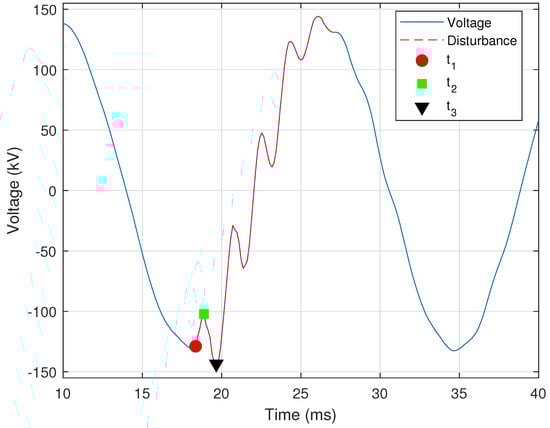 where is the first derivative of the analog signal, is the sample before the first derivative’s sign changes, and is the sample after the sign changes. Multiple sign changes over a short time interval provide a strong indication that a transient disturbance is present within the signal being processed.