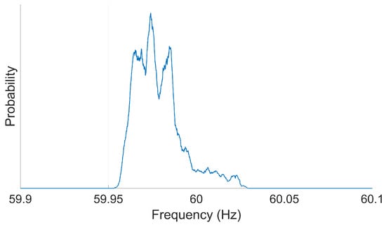 The dominant frequency is calculated using the FFT. The FFT is calculated over all frequencies within . Because the power grid’s frequency is very stable, with an expected maximum deviation of Hz for the 60 Hz fundamental frequency, calculating the FFT over this entire range of frequencies is inefficient. Based on a sampling frequency of 960 Hz, a high-resolution frequency representation (i.e., with a small step size between consecutive frequency values) requires a significant number of zeros (e.g., 1.2 million) to be appended to the end of the time signal. Because the power grid’s frequency is so stable, most of the actionable information is contained within a minimal range of frequencies; thus, most of the resulting frequency response can be “thrown out” without loss of information. Applying zero padding to the time signal wastes computational resources and time, especially when most of the resulting uninformative portions of the frequency response are removed. This problem is addressed by generating a support vector of frequencies centered at 60 Hz and with a Process Bandwidth (PBW) of 0.2 Hz. The PBW can be changed based on the specifics of the DFR or equivalent device and on the preferences or standards of utility personnel. The Discrete Fourier Transform (DFT) of sixty cycles is calculated for only the frequencies specified in the support vector and a step size of thirty cycles between consecutive calculations. This results in the dominant frequency being calculated on a per-second basis, with an overlap of half a second. The FFT is calculated by
