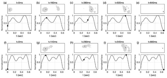 Contact areas and ground reaction forces from (a–e) Participant 1 and (f–j) Participant 2. The upper rows show the spatial distribution of the contact area (shaded by gray) and the center of pressure (black dot) at various times in a gait cycle stance phase []: (a,f) the first heel contact of the lead leg at , (b,g) foot-flat, (c,h) heel-off, (d,i) contralateral heel contact [], and (e,j) toe-off of the lead leg are presented. Below each contact area, the value of the ground reaction force on the center of pressure is marked on the ground reaction force curve (solid line).