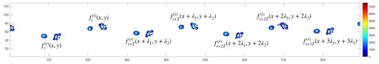 To describe and characterize the dynamical patterns of the plantar pressure in a gait cycle, we consider the plantar pressure as a spatial function in time sequence, where x is the coordinate on the sensor along the walking direction, y is the coordinate perpendicular to x, the subscript is the timesteps with an interval ms, and the superscript indicate the left and right foot, respectively. Generally, the plantar pressure is a periodic function , where indicates the cth gait cycles, T is the temporal period, and is the spatial period between the consecutive gait cycles, respectively (See Figure 2).