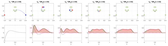The dynamic mode decomposition (DMD) reconstruction. Here, with defined in Equation (7). So, . The green circles indicate the eigenvectors and at , respectively, with each k-th mode filled by the blue and red colors. The squares represent the k-th DMD mode in the state at and the final state (connected to the trajectory of the blue circle).
