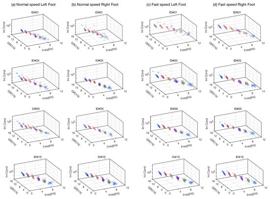 We estimated the person’s ID, . We repeated the 100,000 random selections of 30% sample steps () for the person’s ID x under a uniform distribution. The identification accuracies were 89.89% and 88.10% for the left and right footstep samples, respectively, at a self-paced normal speed. The identification accuracies for the left and right footstep samples at a self-paced fast speed were 86.51% and 88.52%. The high accuracies of the identification rates imply that the centroids of the DMD modes are likely to represent the individual’s unique walking baseline, providing the framework for future studies on the health information associated with gait variability away from the baseline.