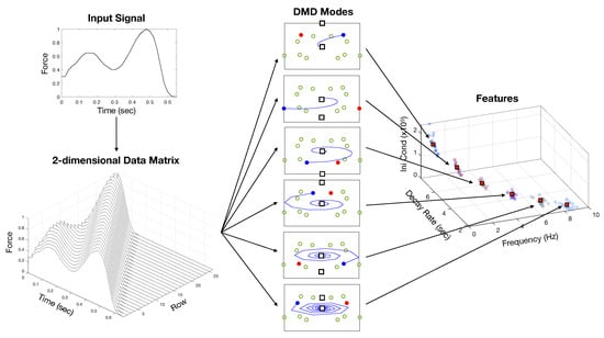 Machine-learning applications are poised to aid clinicians and researchers in tracking neuropathology; today’s gait assessment technologies yield large datasets of complex gait parameters []. Each step in a plantar pressure dataset reveals a complex non-linear dynamical behavior in both spatial distribution and temporal evolutions. In 1931, a data-driven modeling solution for non-linear systems was introduced as Koopman spectral theory. Koopman’s theory linearizes the dynamical systems in an infinite-dimensional vector space [,]. Later, Schmid and Sesterhenn defined the dynamic mode decomposition (DMD) algorithm and demonstrated its ability to provide the spatiotemporal coherent structure from highly correlated fluids data [,]. The core features of DMD are spatial dimensionality-reduction techniques such as the proper orthogonal decomposition (POD) combined with a spectral decomposition such as Fourier transforms. Highly correlated spatial and temporal variables can be separated into a linear superposition of DMD spatial modes with time-dependent coefficients associated with a frequency and a decay rate. The DMD method has at least two advantages: (1) it is simple to execute as an equation-free, data-driven method without assumptions about the underlying system, and (2) it can be used to characterize complex dynamics with key low-rank spatiotemporal features allowing for the physical interpretation in terms of spatial structures and their corresponding temporal responses. But the DMD dimensionality technique has limited application to univariate time-series data without spatial coordinates []. The Hankel DMD algorithm was introduced to address this issue, which involves stacking multiple time-shifted delayed coordinates into a larger augmented matrix, the Hankel matrix []. DMD and DMD variants have now been extensively applied to many modern high-dimensional, nonlinear dynamical systems in the engineering, biological, and physical sciences [,,,,]. Much like these systems, plantar pressures generated by walking exhibit multiscale behaviors in space and time.