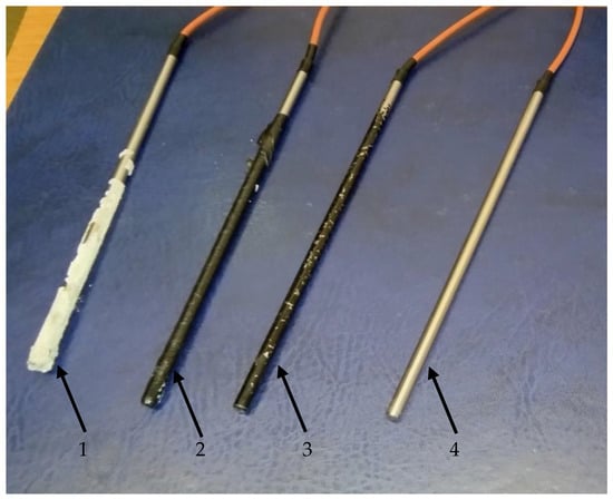 The tested sensors were PT500, Pt100, Ni100, and Cu50 in a 1H18N9T acid-resistant steel housing with a diameter of 6 mm. The article presents test results achieved for Pt500 sensors. The sensors were used in a clean version and with typical marine operational dirt. The temperature sensors were contaminated with paint, insulating tape, and epoxy resin. The sensors used to perform calibration are shown in Figure 3.