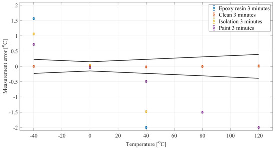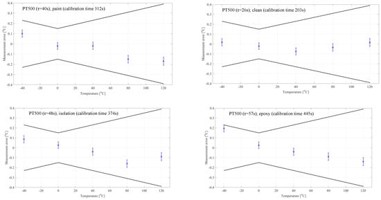 The experimental test consisted of calibration in accordance with the principles adopted in routine tests carried out in metrology centers, taking into account the waiting time between the temperature setting in the furnace and the reading of 3 min. First, we place all the tested sensors in the dry well calibrator. The first measurement point is 0 °C. After the calibrator reaches this temperature, wait 3 min and then the measurement results of individual sensors are read. Then subsequent temperatures are set (40 °C, 60 °C, 120 °C). After reaching each of them, also wait 3 min before taking the measurement. The procedure is similar in the case of negative temperatures. The result of this procedure is shown in Figure 4.