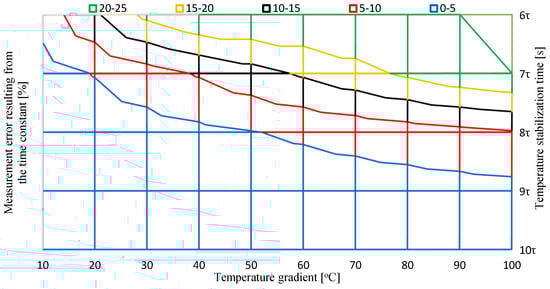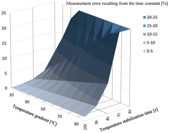 Using the graph in Figure 7, it was determined that with a temperature jump of 40 °C and assuming that the error resulting from temperature stabilization does not exceed 5%, the temperature stabilization time before obtaining the calibration result should be 7.8τ.