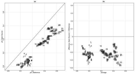 (a) Scatterplot for the pH measurements of the reference versus the open–source device. Each subject is represented by a unique ID number and the repeated values share the same ID subject number symbol. (b) Bland–Altman plot (averages vs. differences) without the limits of agreement.
