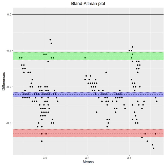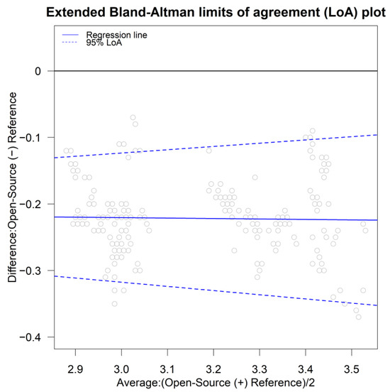 An in-house-built R-script [23] implementing the relevant methods [28] may be used to evaluate CCC and TDI along with their corresponding bounds. Moreover, TDI evaluation and its upper bound, based on an alternative formulation of mixed-effects models [34], can be implemented [35]. CCC evaluation and confidence intervals for inference, instead of a lower bound, using an alternative formulation of mixed-effects models [36,37] can be implemented using the “cccrm” package [38]. The limits of agreement can be evaluated and presented graphically by the “methodCompare” package via the bland_altman_plot() function along with the corresponding extended Bland–Altman plot. A wide data format to implement bland_altman_plot() is needed. The package “blandr” [39] can be used to evaluate the limits of agreement along with their confidence intervals, superimposed on a Bland–Altman plot.