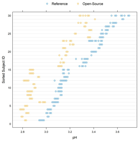 Exploratory data analysis involved three different depiction approaches. Figure 4a displays a scatterplot for the pH measurements of the reference versus the open-source device. To avoid using the same plotting symbol per subject and visualize the repeated measurements, each subject is represented by a unique ID number and the repeated values share the same ID subject symbol. Using this approach, a dependence structure is depicted. A systematic underestimation of the open-source device for pH measurements is apparent. There are two clusters formed in the data. The lower left corresponds to the grapefruit pH while the upper right corresponds to the orange juice.