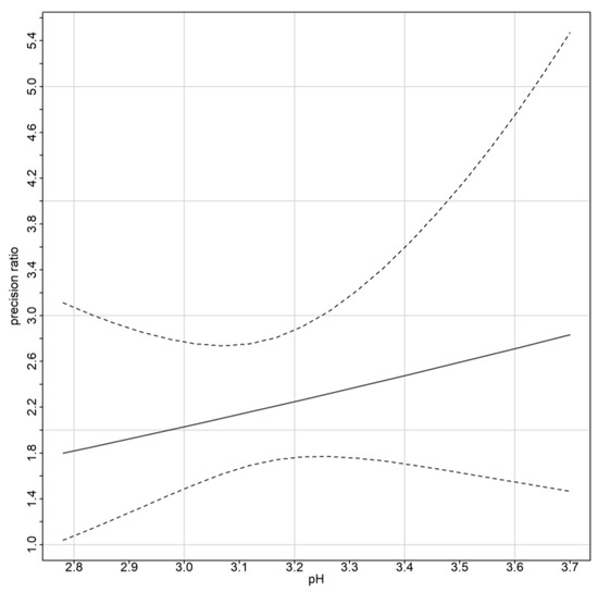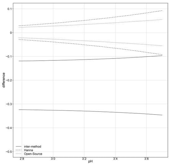 Figure 4b displays a Bland–Altman plot (averages vs. differences) without the limits of agreement. For higher values of pH, the differences seem to have slightly higher spread compared to the lower values of pH. This is a sign of possible heteroscedastic errors. There is no obvious trend in the Bland–Altman plot suggesting a common scale for the assays, verifying the common scale assumption for the mixed-effects model. This is also obvious in the extended Bland–Altman plot, which was produced using the “MethodCompare” package (Figure 5).
