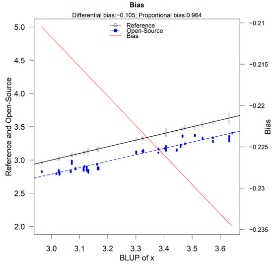 Moreover, the bias plot (bias_plot() function [27]) from the “methodCompare” package evaluates the differential (fixed) and proportional bias (described in Appendix B.1.2) and offers a useful display that quantifies systematic bias (fixed and proportional) along the measurement range.