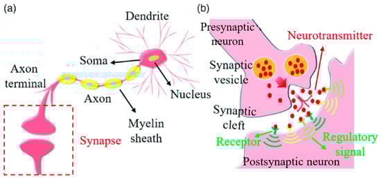 Biological neurons and synapses. (a) Structure and components of neurons. (b) Schematic diagram of a synapse [34].