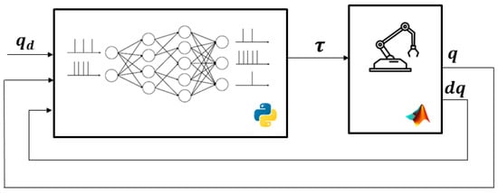 The MATLAB/Simulink tool was used to simulate the robot, recreating its kinematic and dynamic characteristics. Additionally, by utilizing MATLAB’s capability to execute Python code, the SNN controller developed using Nengo was integrated.