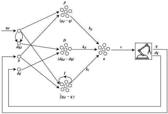 This controller generates a signal that guides the robot joint toward the desired position through continuous error reduction. It consists of three components: the current error value, the derivative of the error (which considers the projected future error value), and the integral of the error (which takes into account past error values). The control signal is calculated by combining these components according to Equation (26), where , and represent the proportional, derivative, and integral gains of the controller.