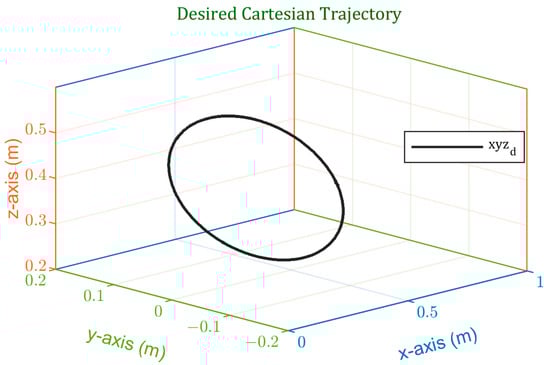 For this study, the subject of control is a 3-DoF robotic arm, characterized by the Denavit–Hartenberg parameters detailed in Table 2, with , , and . The dynamic model of the robotic arm was derived employing the Lagrange–Euler formulation, as specified in Equation (5).