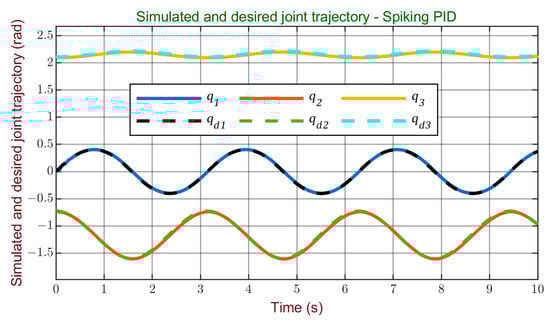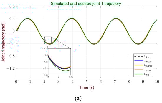 In general, the obtained indices are good and quite close to those achieved by more traditional controllers. This conclusion is supported by the graphical representation in Figure 12, allowing for a comparative analysis of the controllers’ response through the tracking curves of each robot joint.
