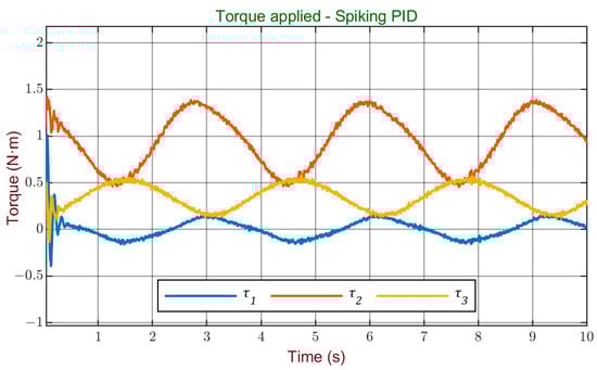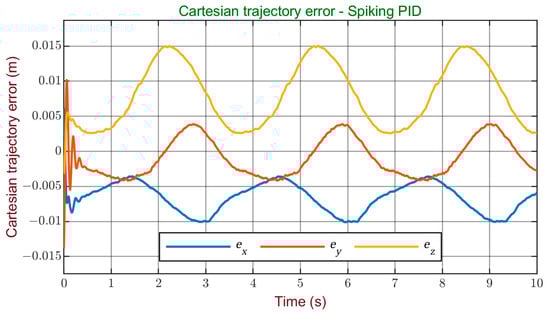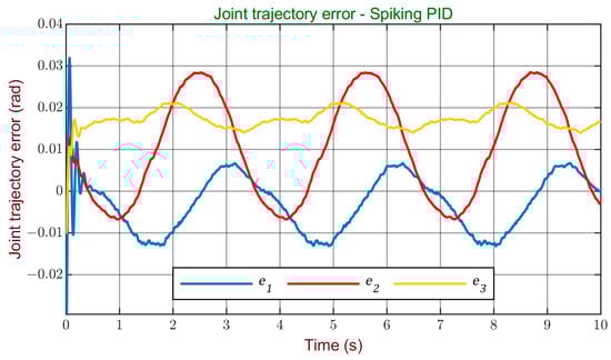 For a quantitative performance analysis, the metrics obtained with the spiking PID controller were compared with those of a conventional PID controller using identical gains. Additionally, comparisons were made with a previously developed fuzzy controller and an ANFIS (adaptive neuro-fuzzy inference system) controller designed for this plant, as detailed in [56]. The evaluation encompassed both Cartesian and joint trajectories, and the corresponding metrics are presented in Table 4 and Table 5.
